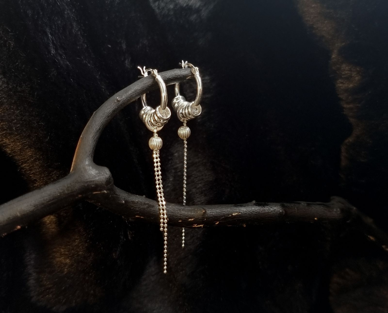 עגיל חישוק מכסף טהור 925 משולב שרשרת כדורים בחיתוך יהלום מכסף טהור 925