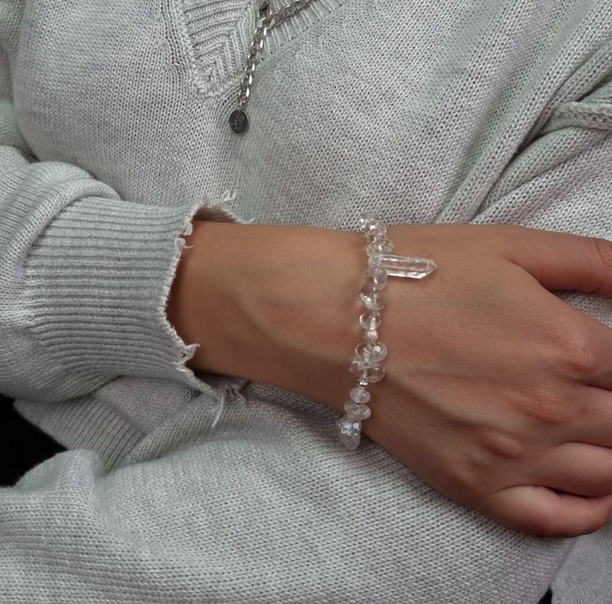 צמיד שבבי אבן קוורץ טבעית, חרוזי כסף טהור בטקסטורות שונות בשילוב חרוזי קריסטל צ'כי סוגרים ושרשרת מכסף טהור 925.