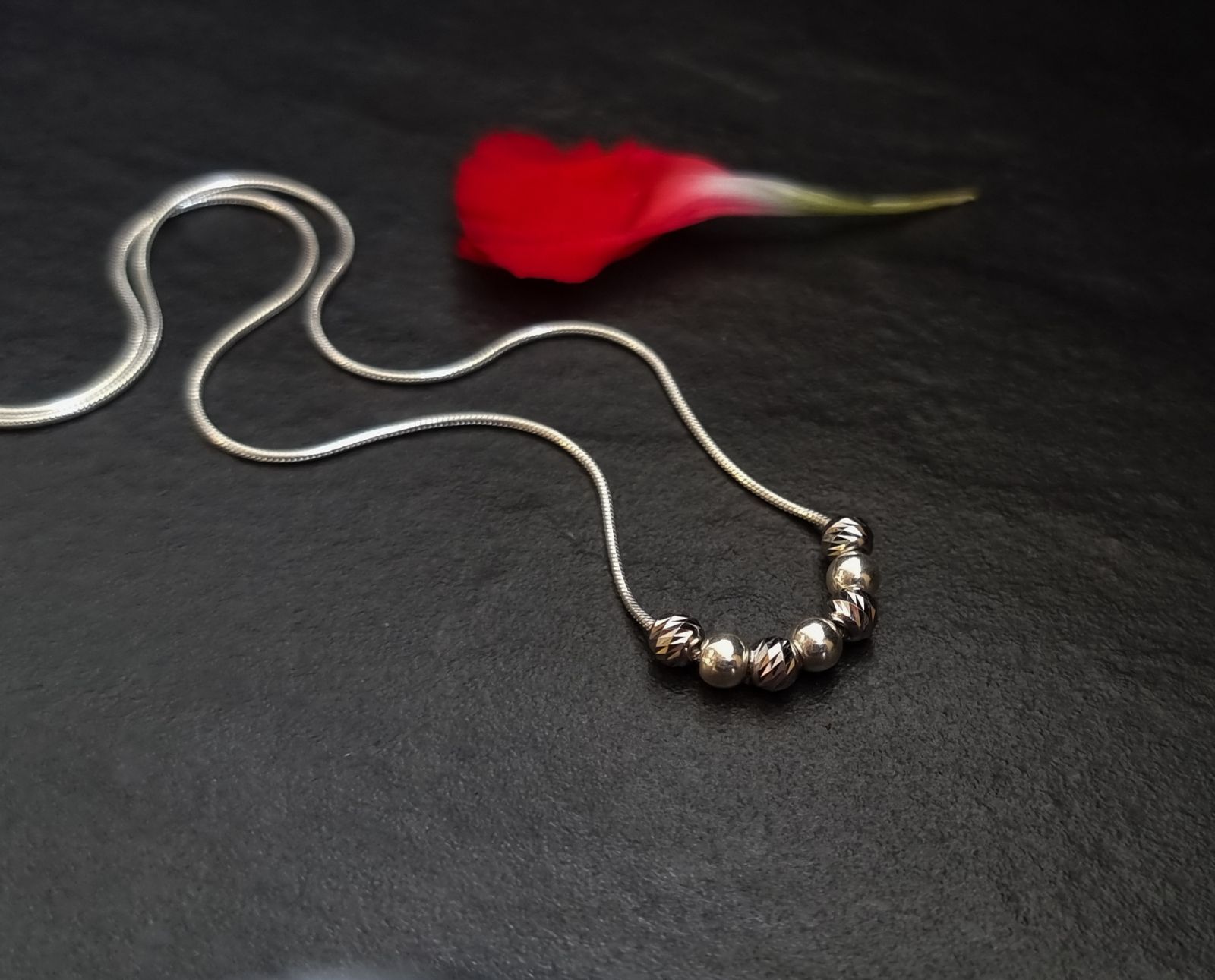 שרשרת נחש מכסף טהור 925 משולבת חרוזי כסף בגימור חיתוך יהלום מנצנצים וחרוזי כסף טהור חלקים.
